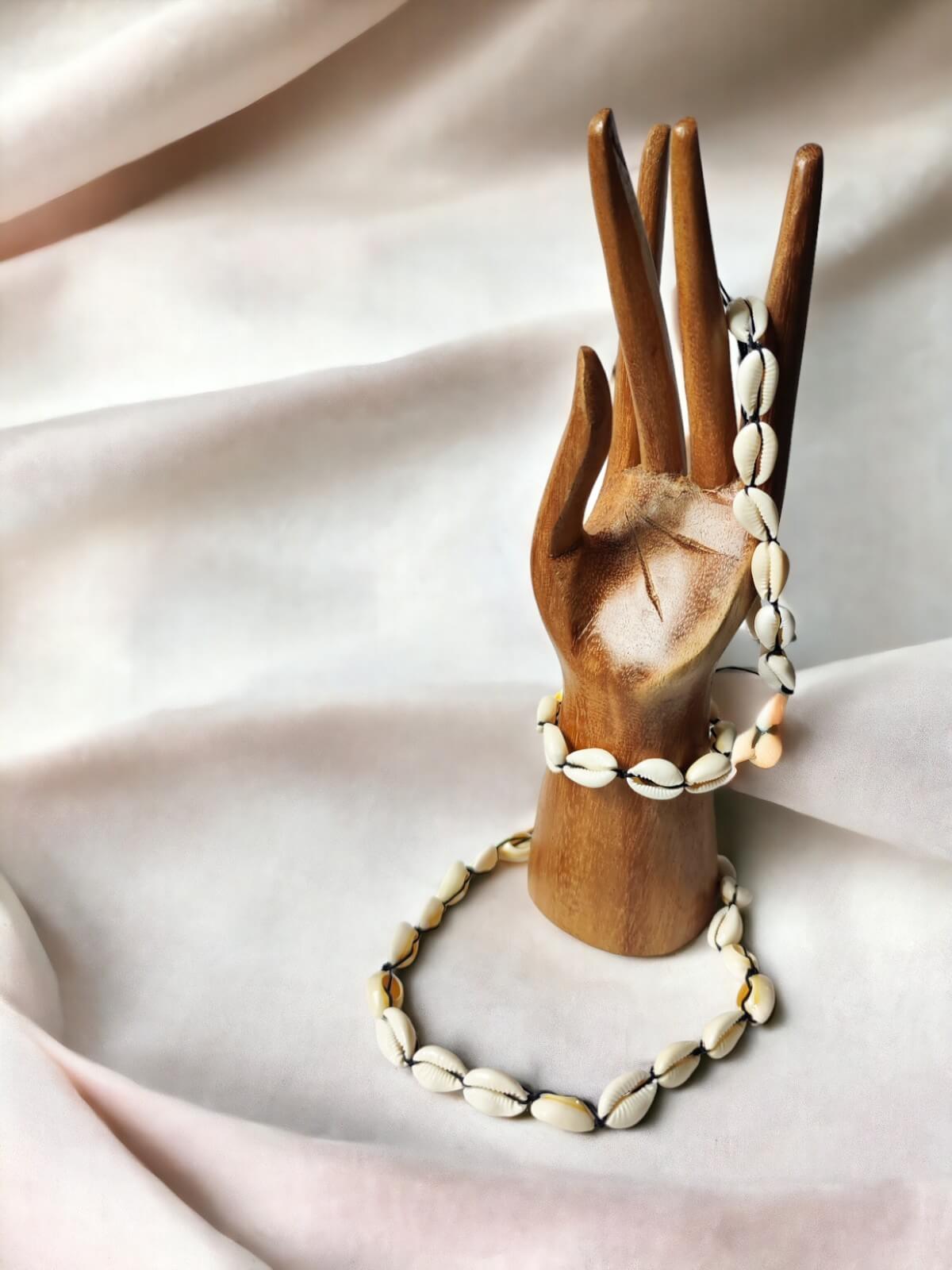 Calm Shores to kolekcja biżuterii inspirowanej spokojem i harmonią nadmorskich wybrzeży. Wykonana ze sznurka i małych muszelek kauri, ta kolekcja emanuje naturalnym urokiem i delikatnością. Bransoletki na rękę i nogę mają regulowane obwody za pomocą sznurka, co czyni je praktycznymi i łatwymi do dopasowania.
