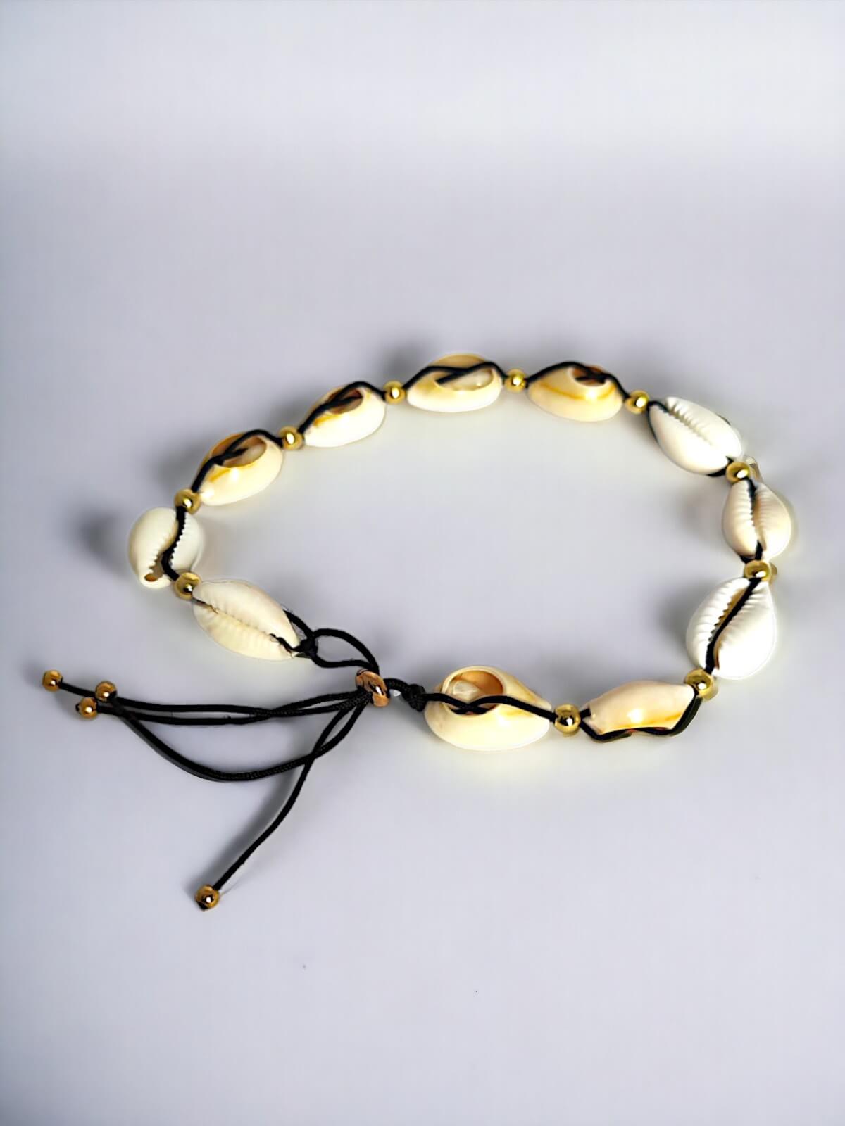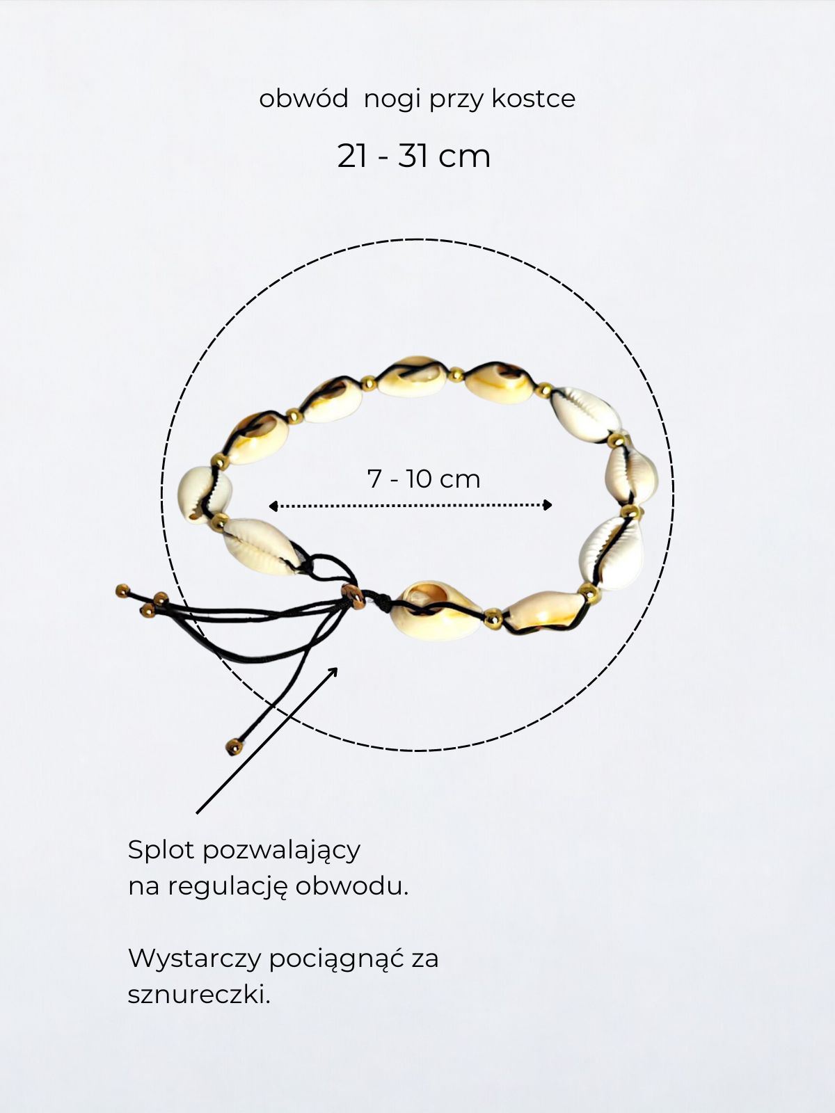 Marzysz o delikatnym akcencie na swoich kostkach? Bransoletka na stopę z czarnym sznurkiem z kolekcji Sandy Harmony to idealna opcja. Naturalne muszle kauri i pozłacane stalowe przekładki tworzą harmonijną całość, która doda uroku każdemu letniemu lookowi. Poczuj letni klimat na swoich nogach – zamów teraz!
