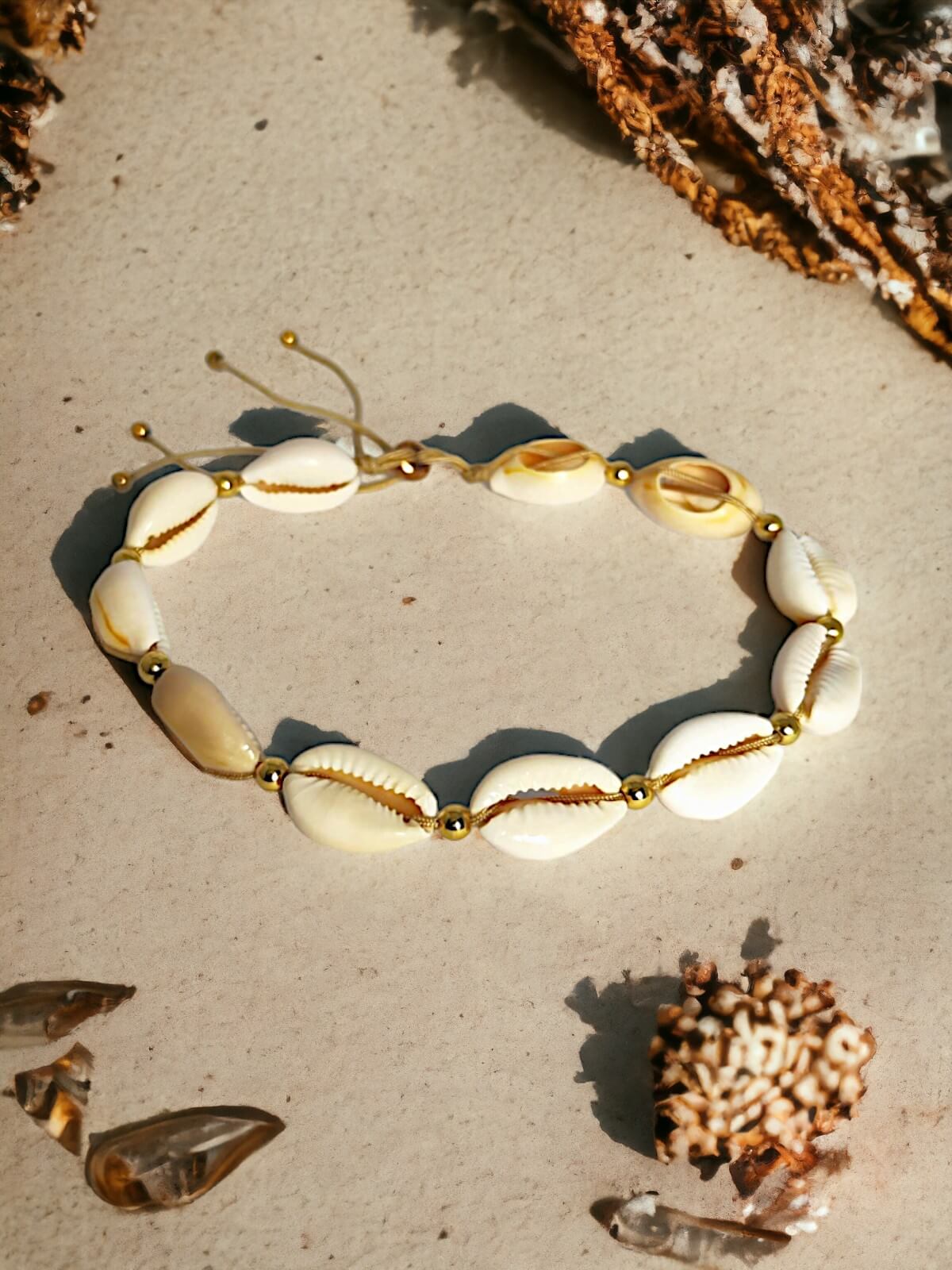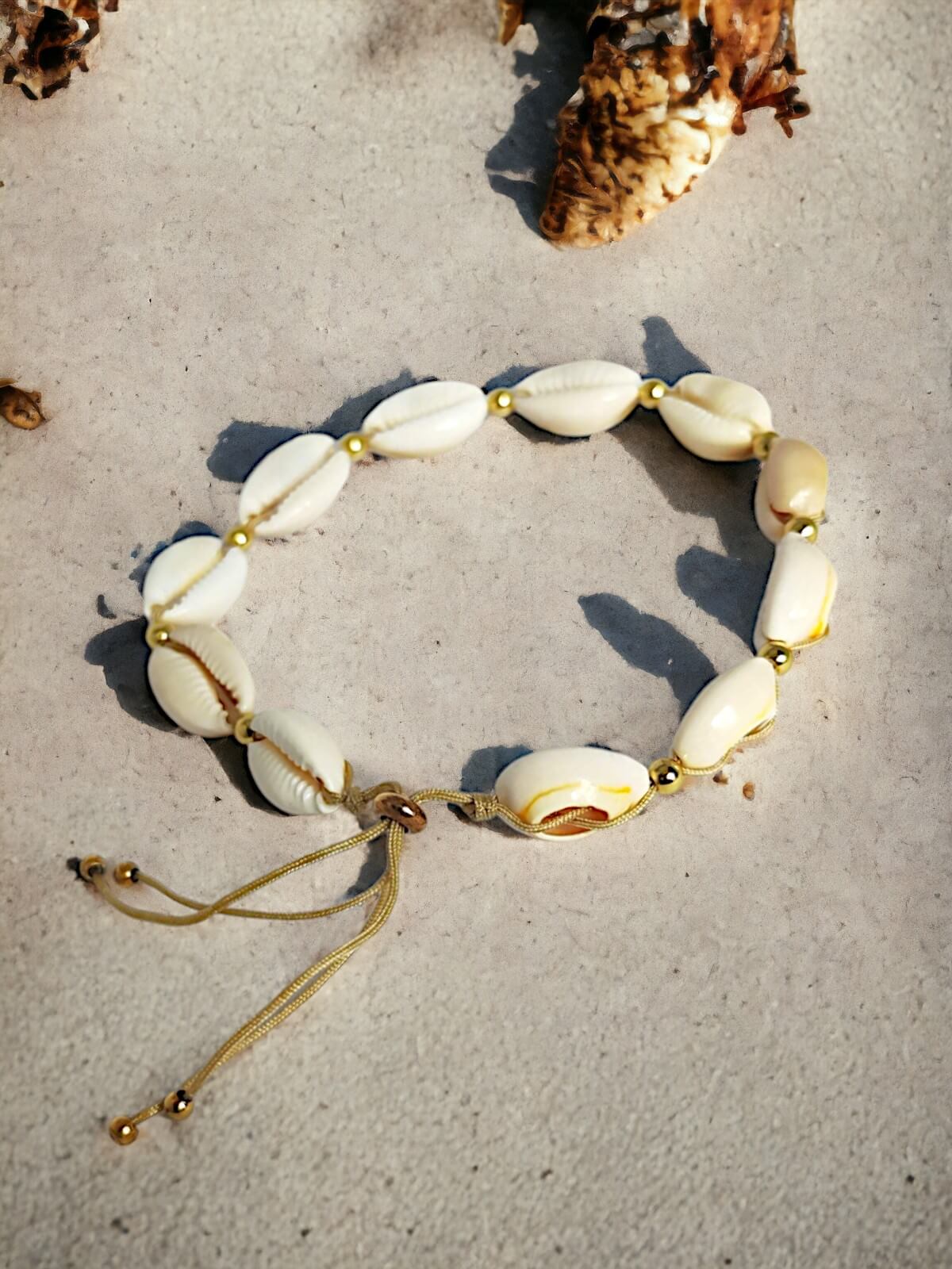 Sandy Harmony to kolekcja biżuterii, która przeniesie Cię na piaszczyste plaże, gdzie harmonia z naturą staje się rzeczywistością. Każdy element tej kolekcji, od bransoletek na rękę i stopę po naszyjniki i chokery, jest starannie wykonany z naturalnych muszli kauri, przeplatanych pozłacanymi stalowymi przekładkami.