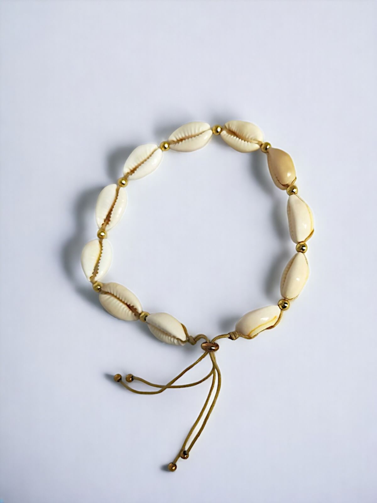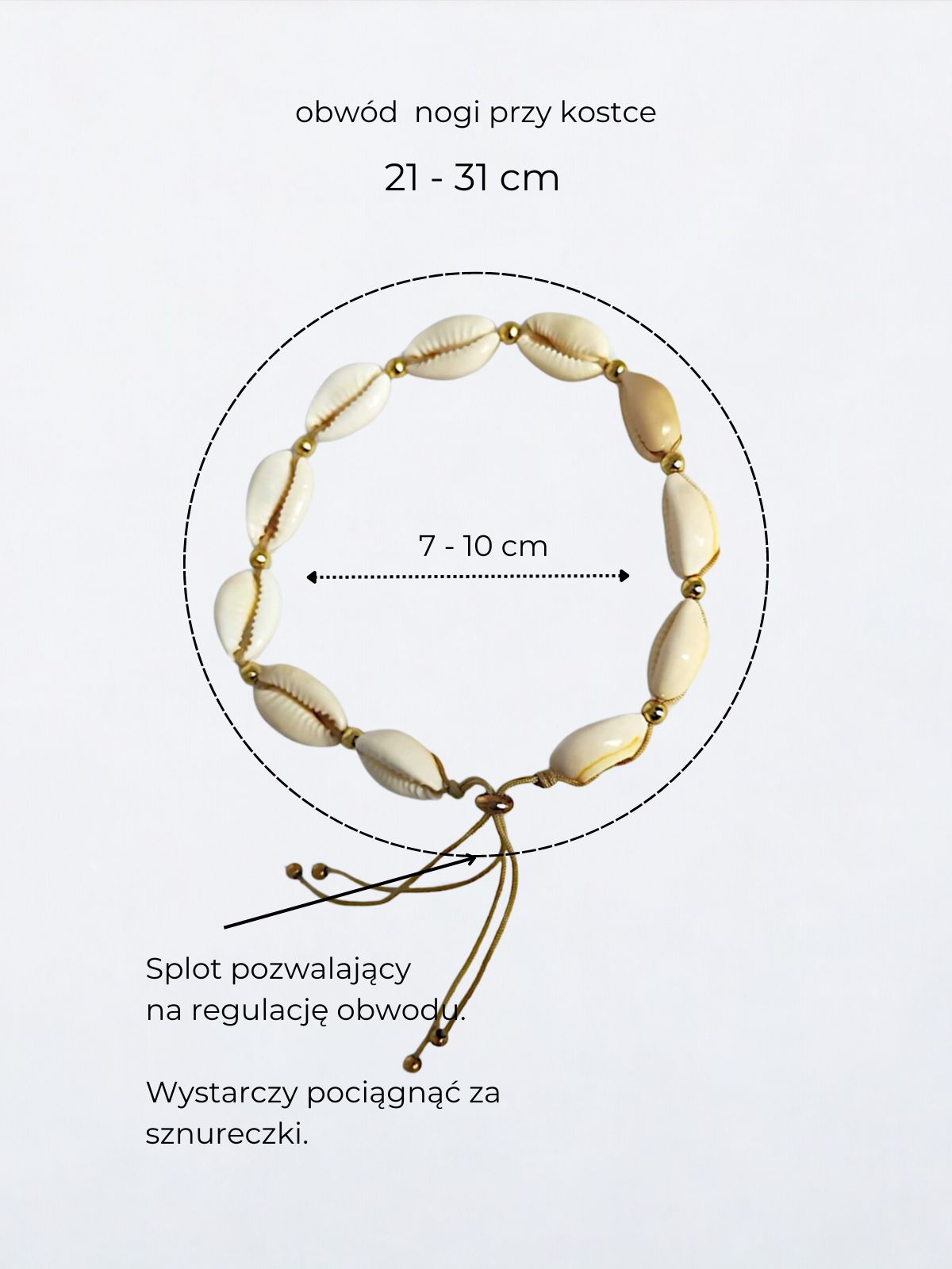 Chcesz podkreślić swój kobiecy styl? Bransoletka na stopę z jasnym sznurkiem z kolekcji Sandy Harmony to elegancka ozdoba, która łączy naturalne muszle kauri z subtelnymi, pozłacanymi przekładkami. Idealna na letnie dni i wieczory, kiedy chcesz wyglądać wyjątkowo. Dodaj ją do swojej kolekcji i ciesz się naturalnym pięknem każdego dnia!