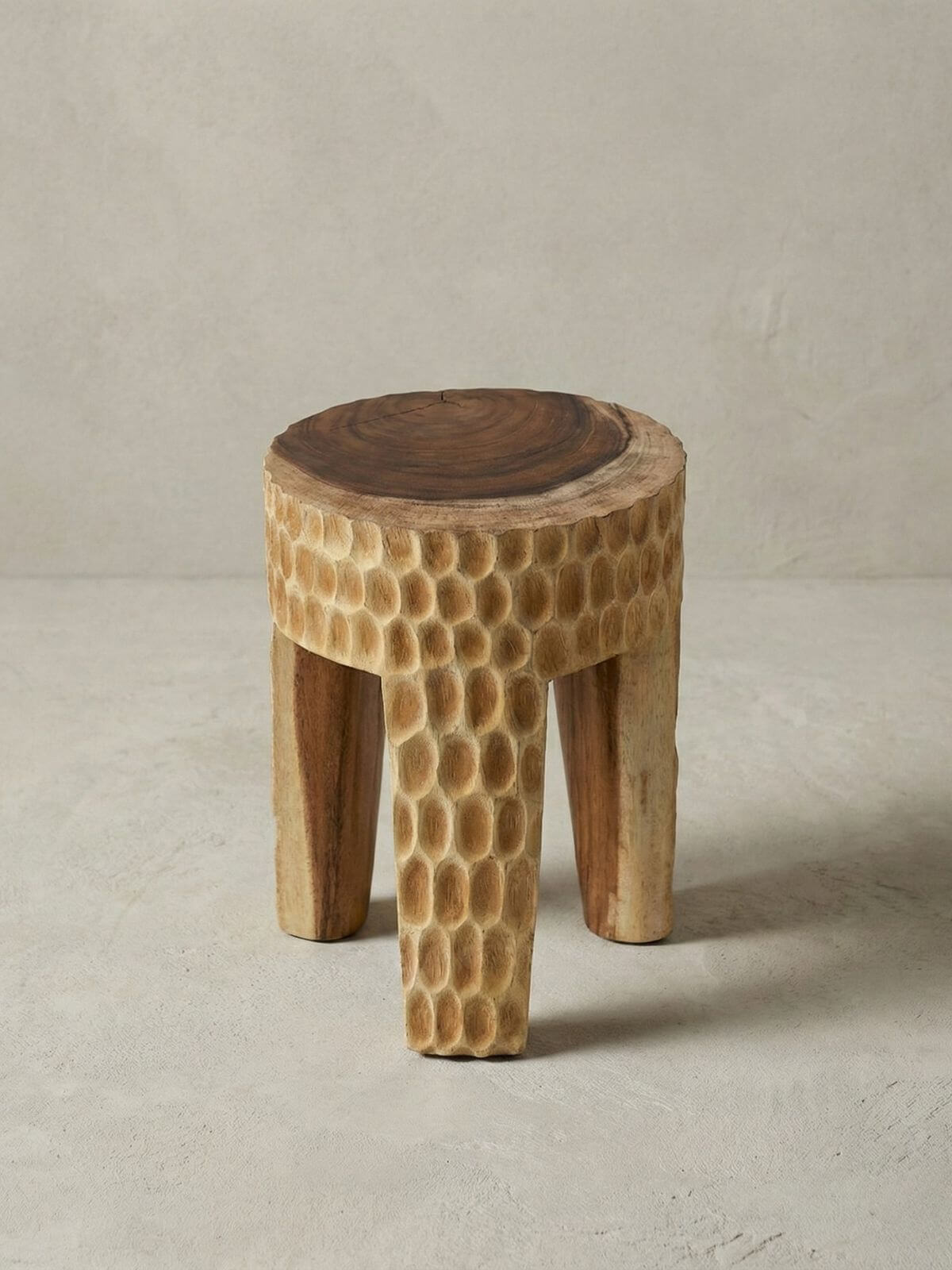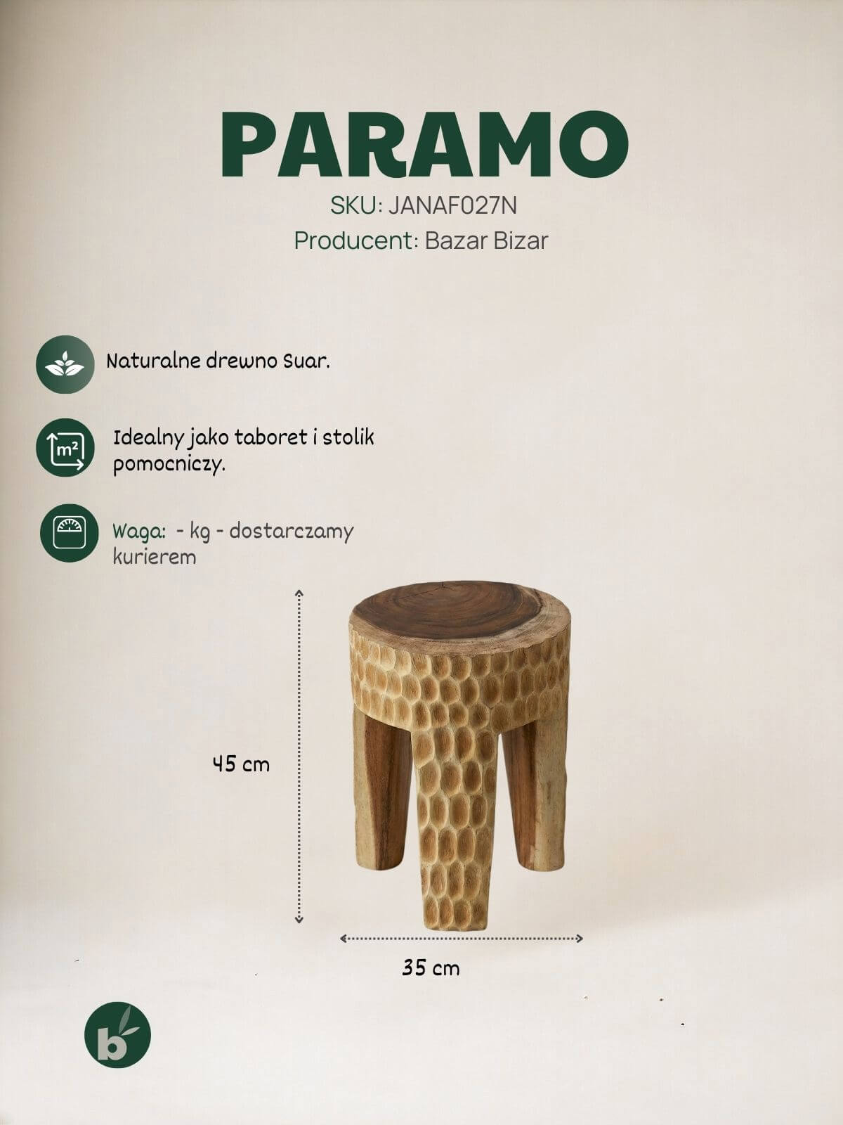 Drewniany taboret w stylu wabi sabi Paramo to powrót do korzeni. Trzy nogi – najbardziej pierwotna, stabilna konstrukcja znana ludzkości – dźwigają masywne siedzisko z jednego kawałka drewna Suar. Żadnych zbędnych ozdobników. Czysta forma.