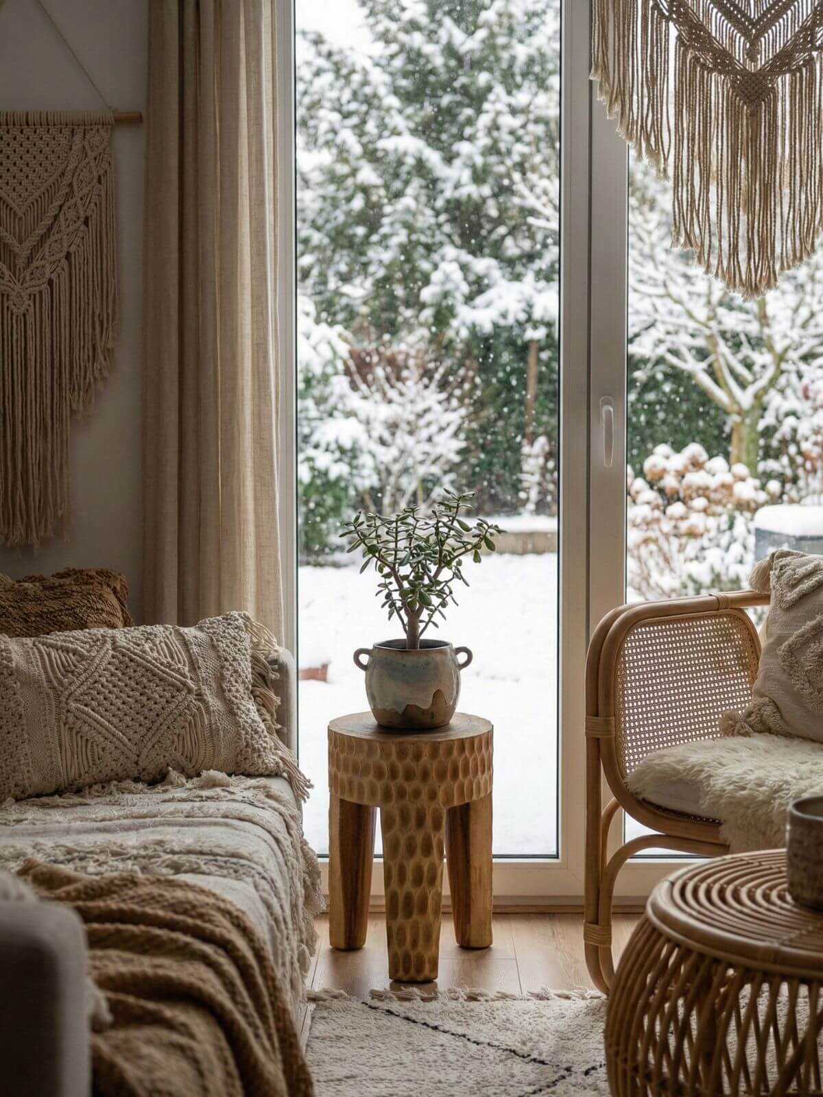Drewniany taboret w stylu wabi sabi ramo w kolorze naturalnym.
