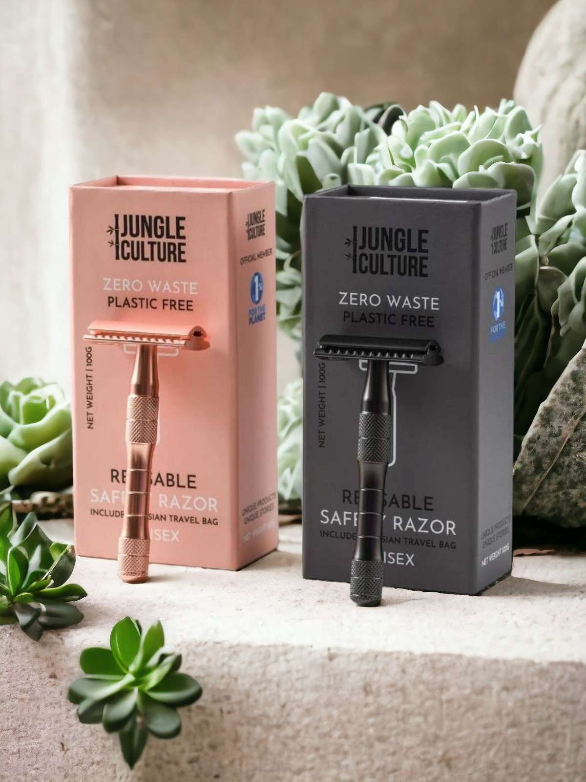 Seria ekologicznych maszynek do golenia z metalu została zaprojektowana przez Jungle Culture z myślą o początkujących użytkownikach. Maszynki mają ergonomiczny, teksturowany uchwyt, który zapobiega poślizgowi, jest idealnie wyważony, aby zwiększyć komfort i aby zapewnić golenie bez wysiłku.