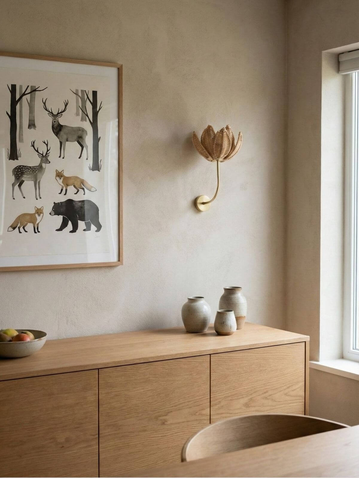 Ze względu na specyficzny kształt klosza, polecamy małe żarówki LED (np. w kształcie kulki) o gwincie E27. Ważne, aby moc nie przekraczała 6W LED, co zapewni bezpieczeństwo dla naturalnego materiału.
