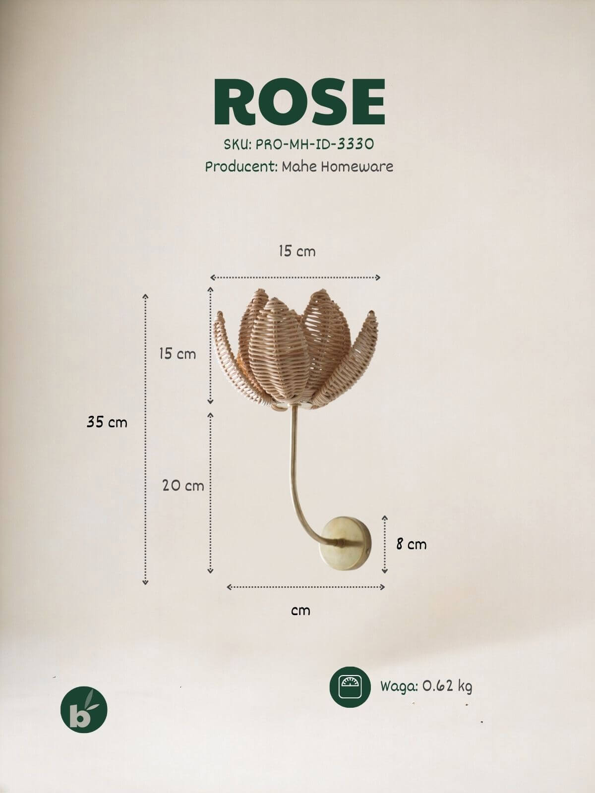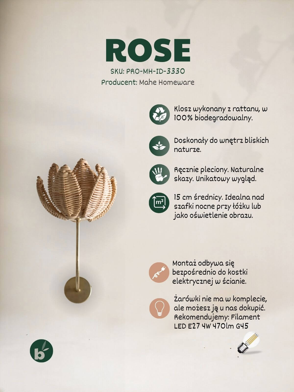 1x Ręcznie wyplatany kinkiet róża (klosz zintegrowany z ramieniem).
