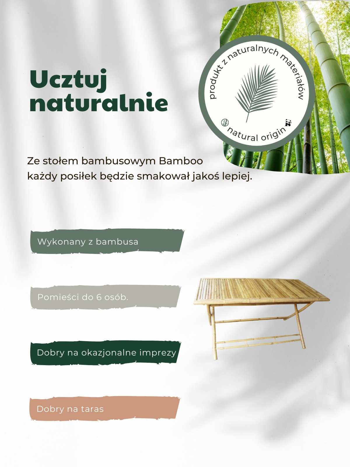 Pragniesz stołu, który będzie centrum Twojego domu? Wybierz nasz stół bambusowy Bamboo! Doskonałe wymiary i przemyślany design umożliwiający pomieszczenie 6 osób czynią go niezastąpionym. Idealny zarówno do codziennych posiłków, jak i większych imprez.