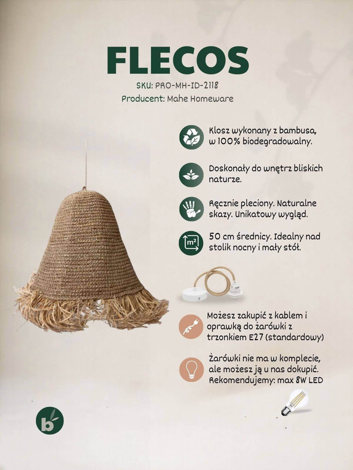 Ważne – Źródło światła: Ze względu na specyfikę materiału (sucha rafia), należy stosować wyłącznie żarówki LED, które nie emitują ciepła. Maksymalna zalecana moc to 8W LED. Używanie tradycyjnych żarówek żarowych stwarza ryzyko przesuszenia materiału lub pożaru.