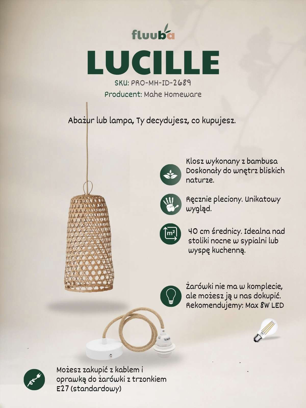 Ponieważ żarówka w modelu Lucille jest widoczna przez ażurowy splot, polecamy ozdobne żarówki LED typu „filament” (z widocznymi pręcikami) o ciepłej barwie światła. Taka żarówka sama w sobie jest ozdobą i dopełnia wygląd lampy.