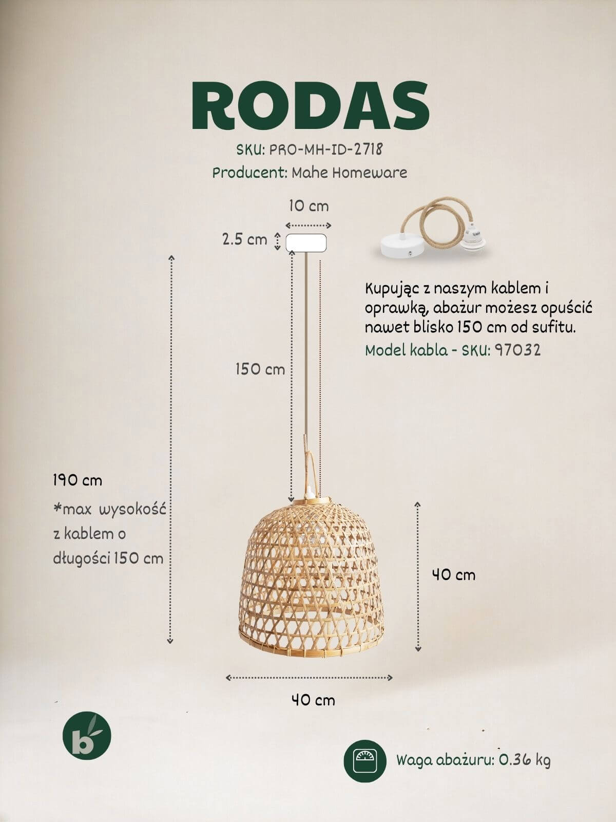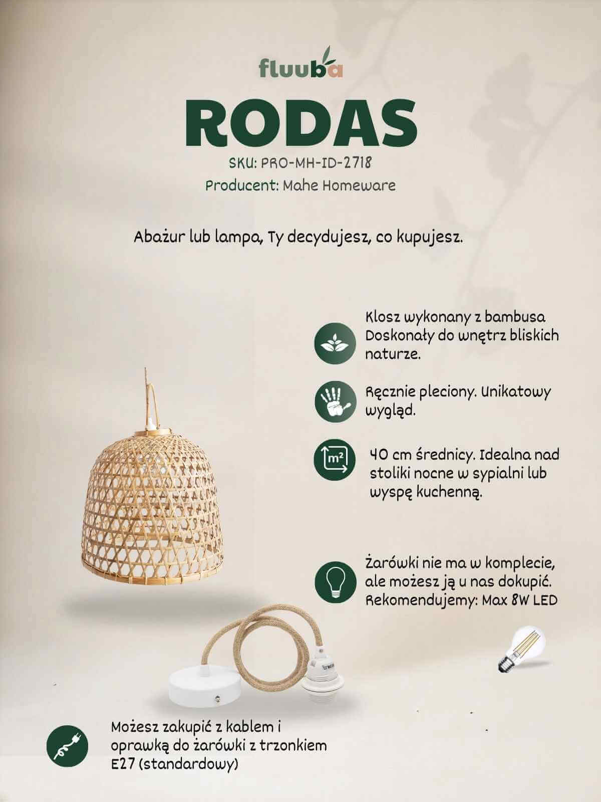 Unikatowość: Każda lampa bambus Rodas jest wyplatana ręcznie. Dlatego poszczególne sztuki mogą minimalnie różnić się odcieniem czy splotem. To cecha produktu rzemieślniczego, nie wada.