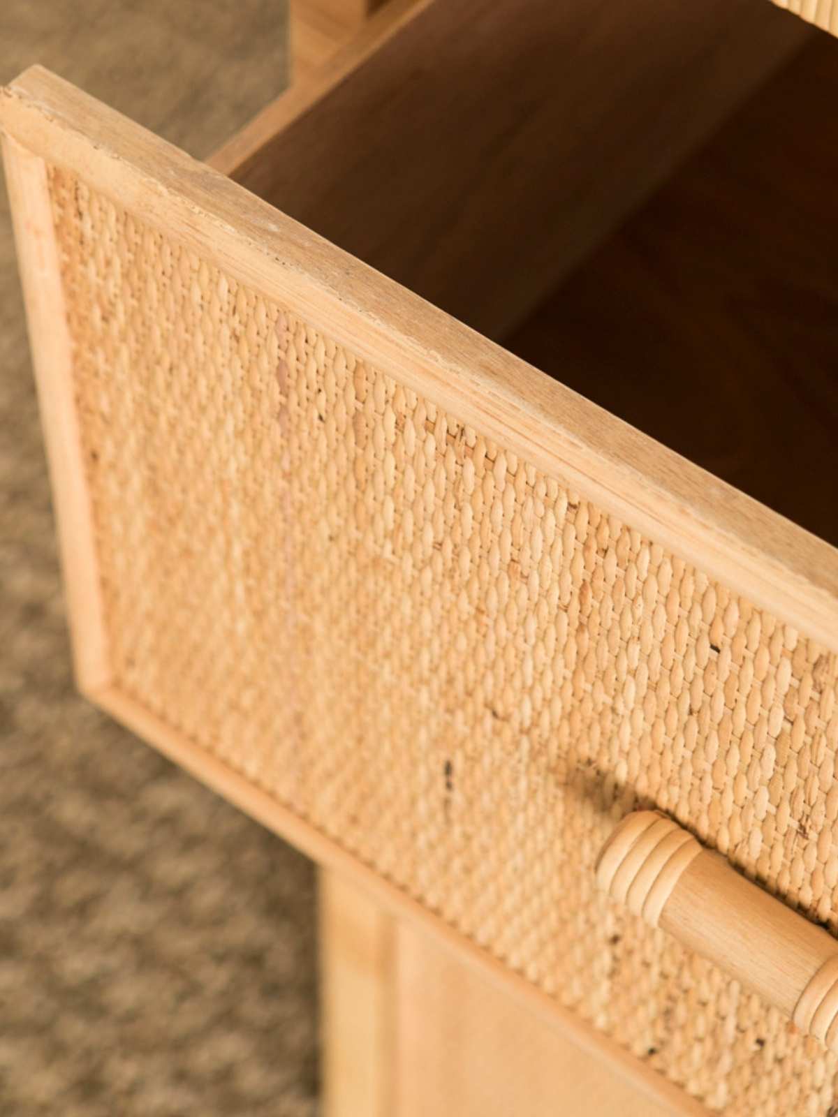 Komoda Simone to połączenie tradycyjnego rzemiosła z nowoczesnym designem. Wykonana ręcznie przez wykwalifikowanych rzemieślników, stanowi doskonały dodatek do każdego wnętrza. Jej trzy praktyczne szuflady zapewniają odpowiednią ilość miejsca do przechowywania, a jej rattanowa struktura dodaje wnętrzom ciepła i przytulności.
