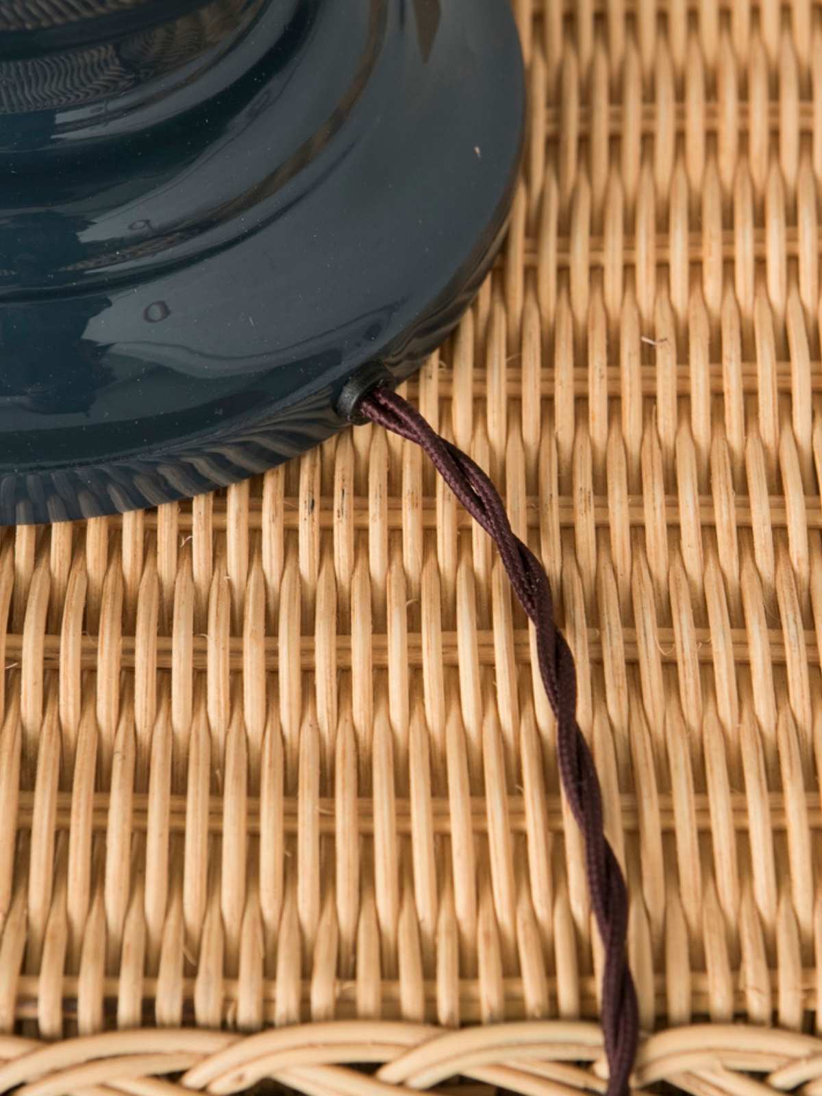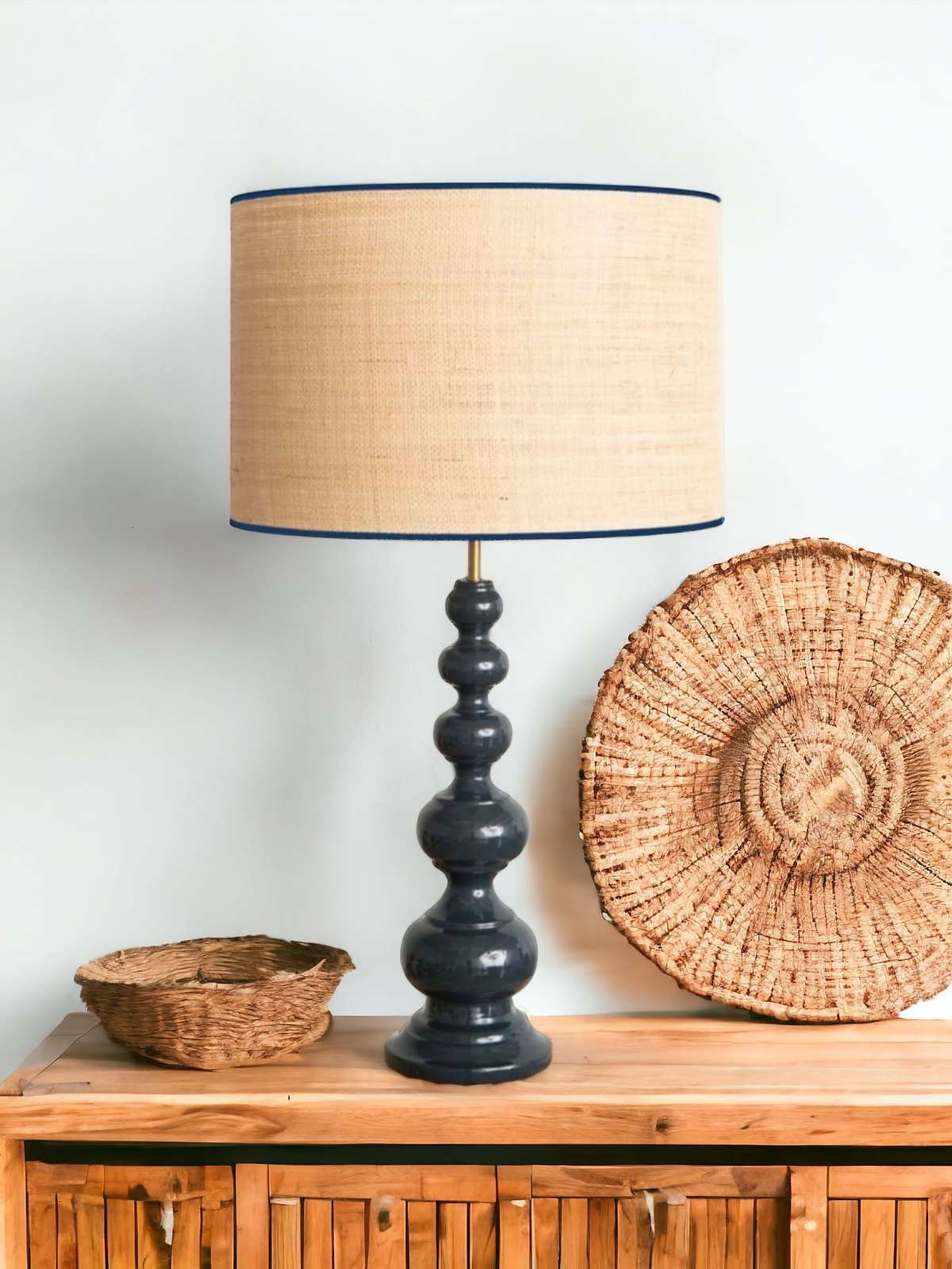 • Wyjątkowy abażur: Okrągły abażur z rafii z niebieską tasiemką na brzegach dodaje lampie delikatności i stylu.