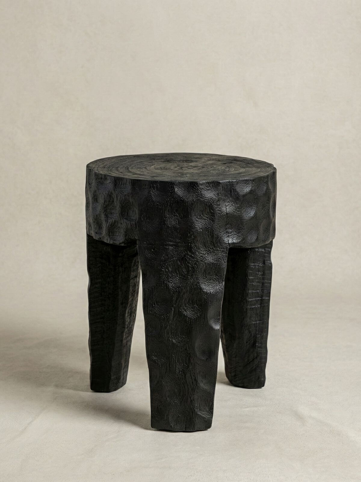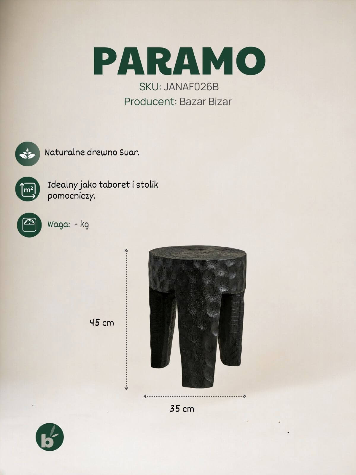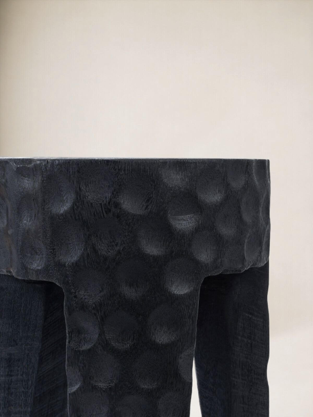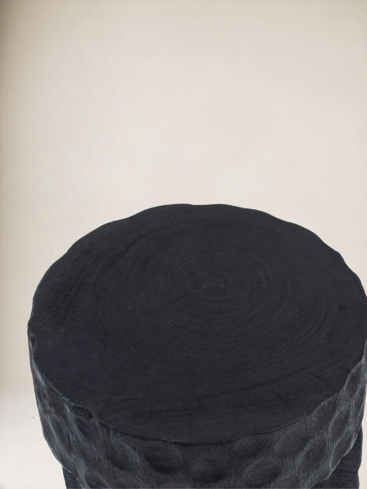 Ten taboret czarny drewniany Paramo to mistrz drugiego planu, który kradnie całe show. Nie jest to płaski, plastikowy czarny kolor z fabryki. To drewno Suar nasycone barwnikiem, spod którego wciąż przebija natura – pęknięcia, faktura, życie.